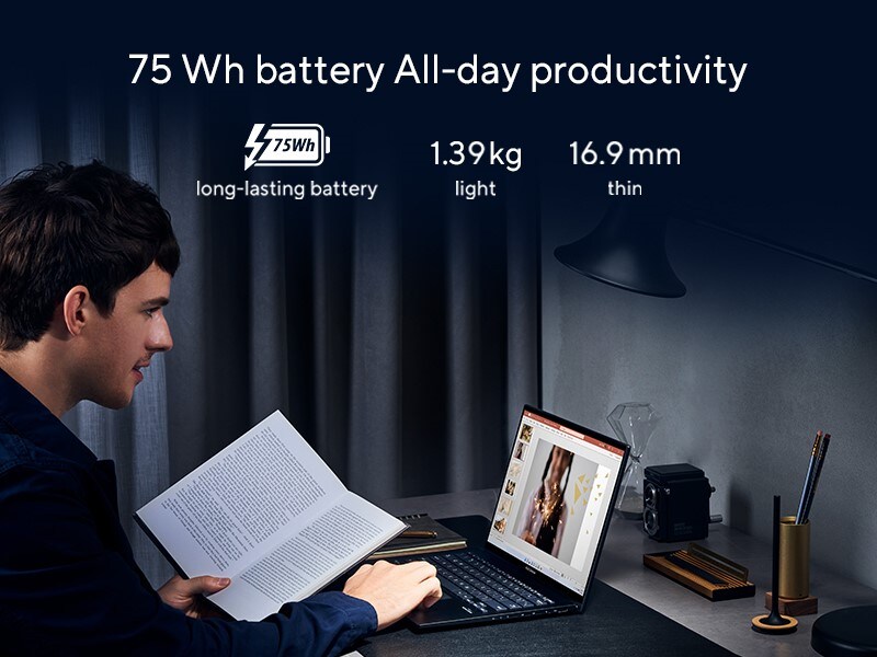 The Zenbook 14 OLED Laptop slim, lightweight design won't weigh you down as much as other laptops. And with the long-lasting 75 Wh battery inside, you can stay productive for up to 22 hours *(Battery life depends on conditions of usage) And when it's time to charge, there's no need to slow down — in just 49 minutes you can top it up to a 60% charge level.