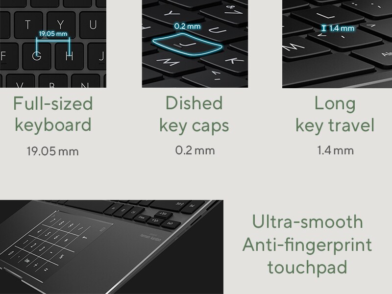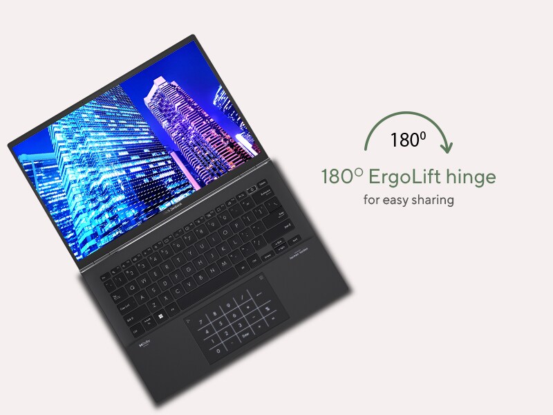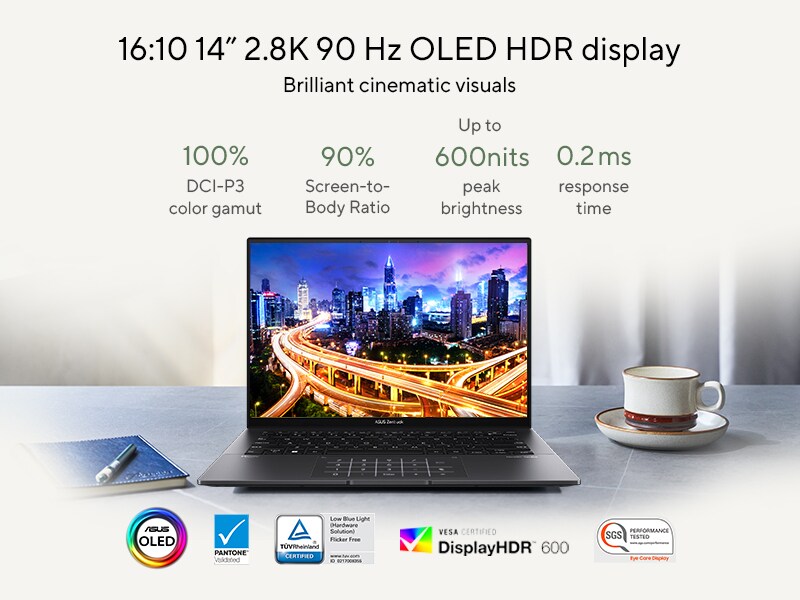 Enjoy immersive, incredibly detailed visuals with ultra-vivid colors on Zenbook 14 OLED amazing 16:10 2.8K OLED NanoEdge touchscreen. The slim-bezel NanoEdge design has a 90% screen-to-body ratio, making Zenbook 14 OLED laptops both svelte and compact.
