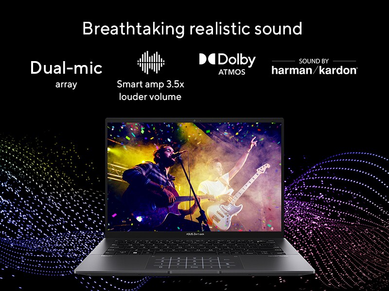 Zenbook 14 OLED has a Dolby Atmos stereo sound system that’s certified by the audio experts at Harman Kardon. It delivers powerful, immersive sound that’s crystal-clear, with the multi-dimensional soundscape of Dolby Atmos.