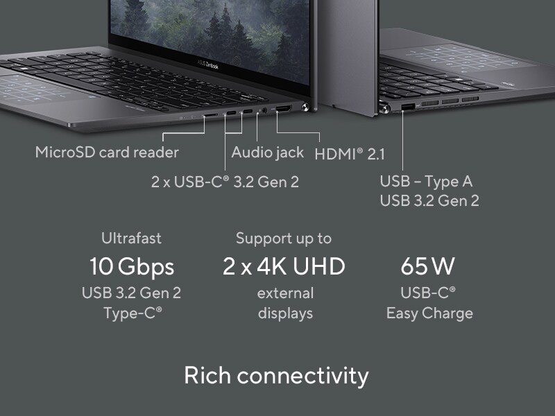 Zenbook 14 OLED is packed with all the I/O ports you need for easy connectivity to your devices and peripherals. The latest ultrafast USB 3.2 Gen 2 Type-C® ports support fast charging, 4K UHD external displays and up to 10 Gbps data transfers, and there’s also an HDMI® 2.1 port and a USB 3.2 Gen 2 Type-A port alongside a microSD card reader. Communications and audio I/O are taken care of by the convenient audio combo jack.