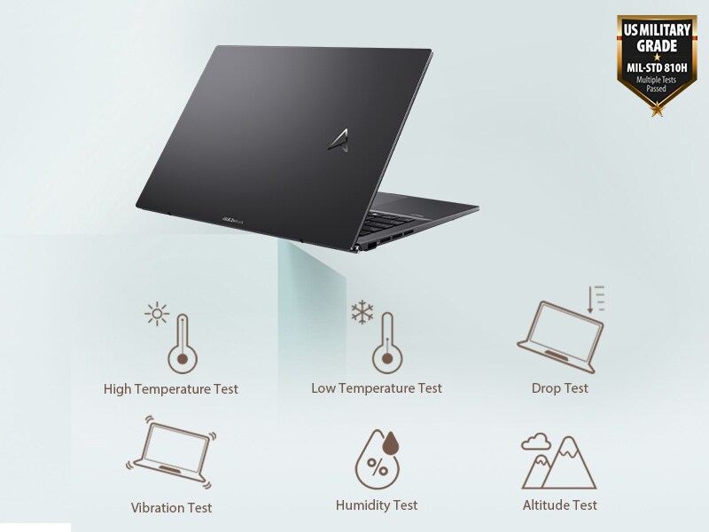 Zenbook 14 OLED has been tested to meet the ultra-demanding MIL-STD-810H U.S. military standard for reliability and durability. Tests consisted of a punishing regime designed to ensure survival in harsh environments, and included power-on drop tests, vibration tests, and operation at extremes of humidity, altitude and temperature.