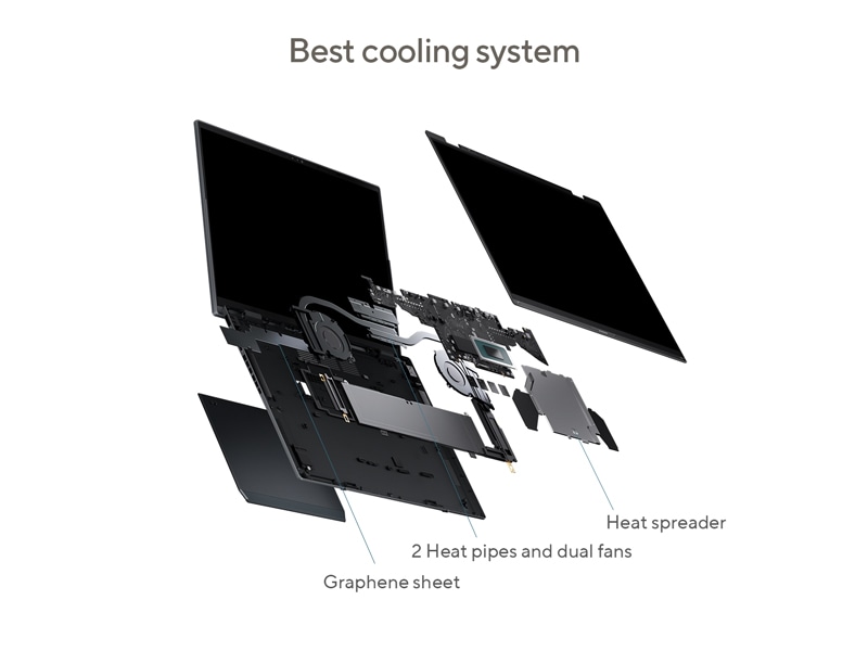 All these powerful components need to be cooled effectively in order to reach their full potential. Zenbook DUO adds a heat spreader between the motherboard and the OLED panel as part of the advanced cooling system, which allows the CPU and GPU to run at up to a 35 W combined TDP, without throttling!