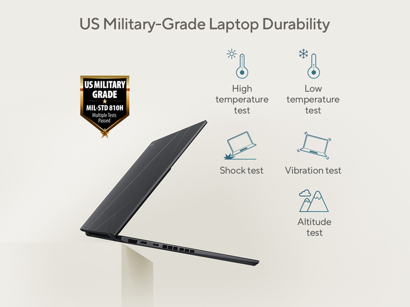 ASUS consumer laptops meet the ultra-demanding MIL-STD 810H military standard20 for reliability and durability, undergoing a punishing test regime that includes extended tests for operation in harsh environments