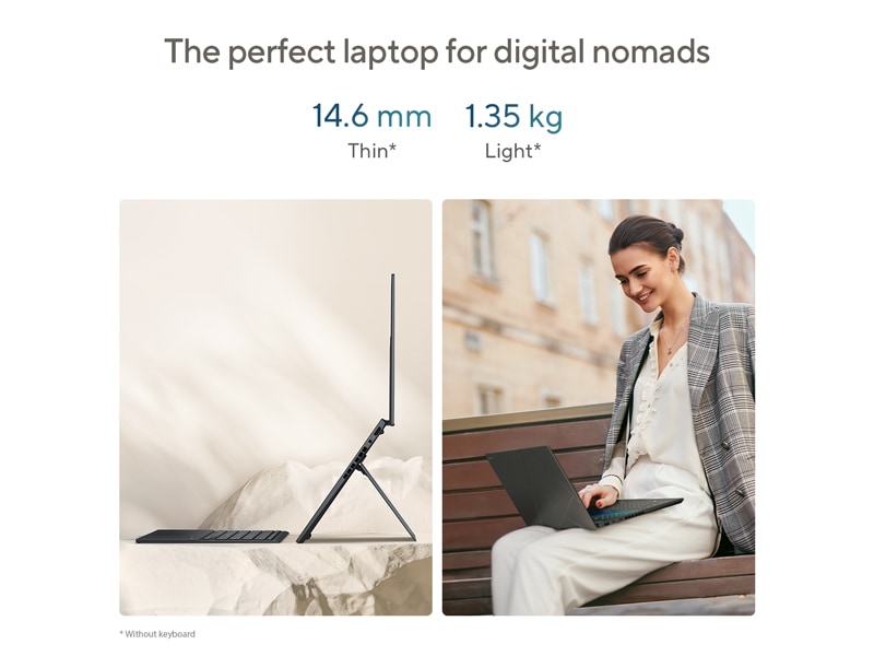 Dual 16:10 14-inch FHD+ (1920 by 1200) ASUS Lumina OLED touch displays enlarge your outlook, with up to 500 nits brightness, and 91% screen-to-body ratio.