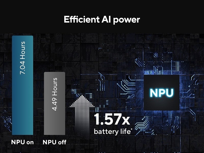 Intel® AI Boost Neural Processing unit (NPU) is a groundbreaking integrated AI engine that seamlessly delivers enriched collaboration, heightened productivity through local AI assistants, and superior video editing quality — all while conserving battery life. With exceptional performance per watt, it efficiently reimagines AI capabilities.