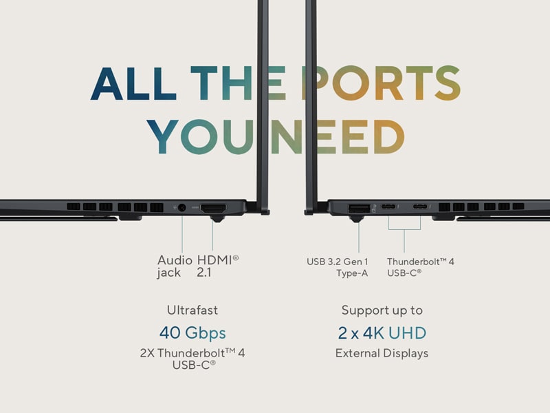 ASUS Zenbook DUO packs in all the connections you need. The two ultrafast Thunderbolt 4 USB-C ports support fast charging, two 4K 60 Hz or one 8K 60Hz external displays, and up to 40 Gbps data transfers.