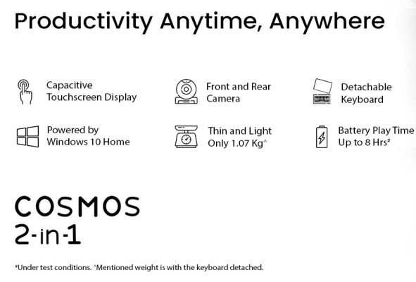COSMOS 2-in-1 can run a variety of Windows applications with battery life up to eight hours. It has a microSDXC card reader built in, equipped with a 3.5mm audio jack, a mini HDMI port and a USB 3.0 interface, taking care of the users' needs in every way possible.