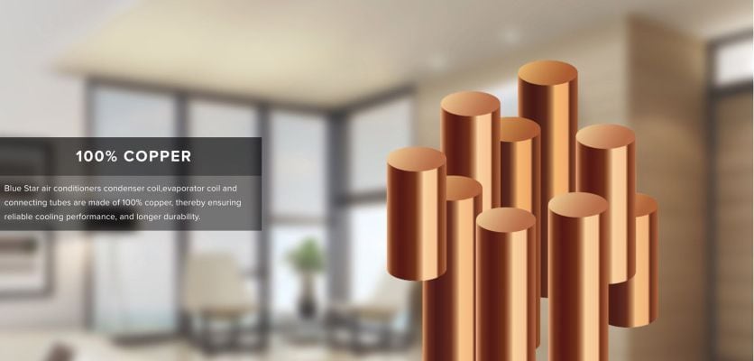 100% Copper – Blue Star Air Conditioners condenser coil, evaporator coil and connecting tubes are made of 100% copper, thereby ensuring reliable cooling performance, and longer durability.