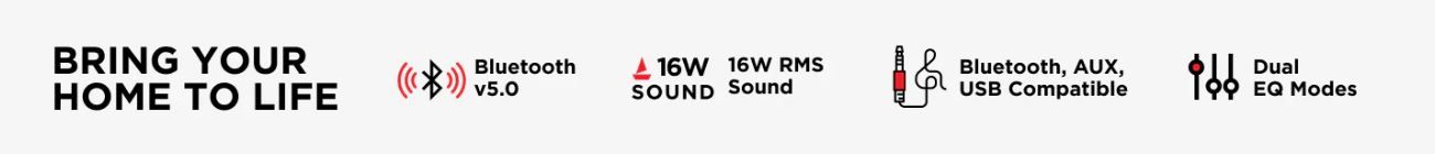 | Key Features | Bluetooth 5.0 connectivity 16 Watts RMS sound Bluetooth, AUX, USB Compatible Dual EQ Mode, Up to 4.5 Hours Of Playtime With Built-in Mic, Deep Bass & Balanced |