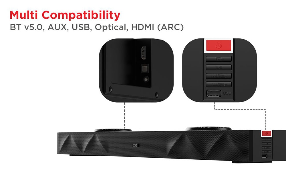 - BT v5.0, AUX, USB, HDMI(ARC)
