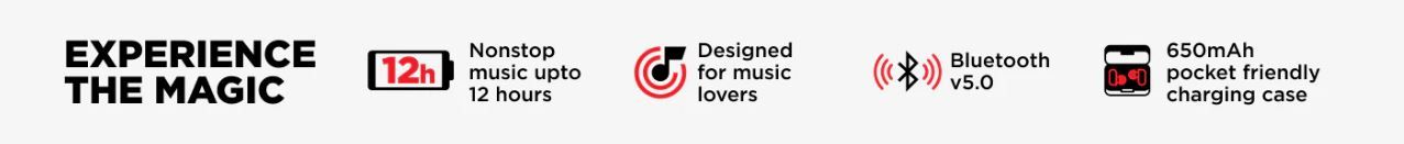 | Key Features | Seamless Bluetooth 5.0Signature Sound For Music LoversInsta’ Wake N Pair, That ConnectsFeatherweight For Comfort All-DayNon-stop music up to 12 hours650 mAh pocket friendly charging case |