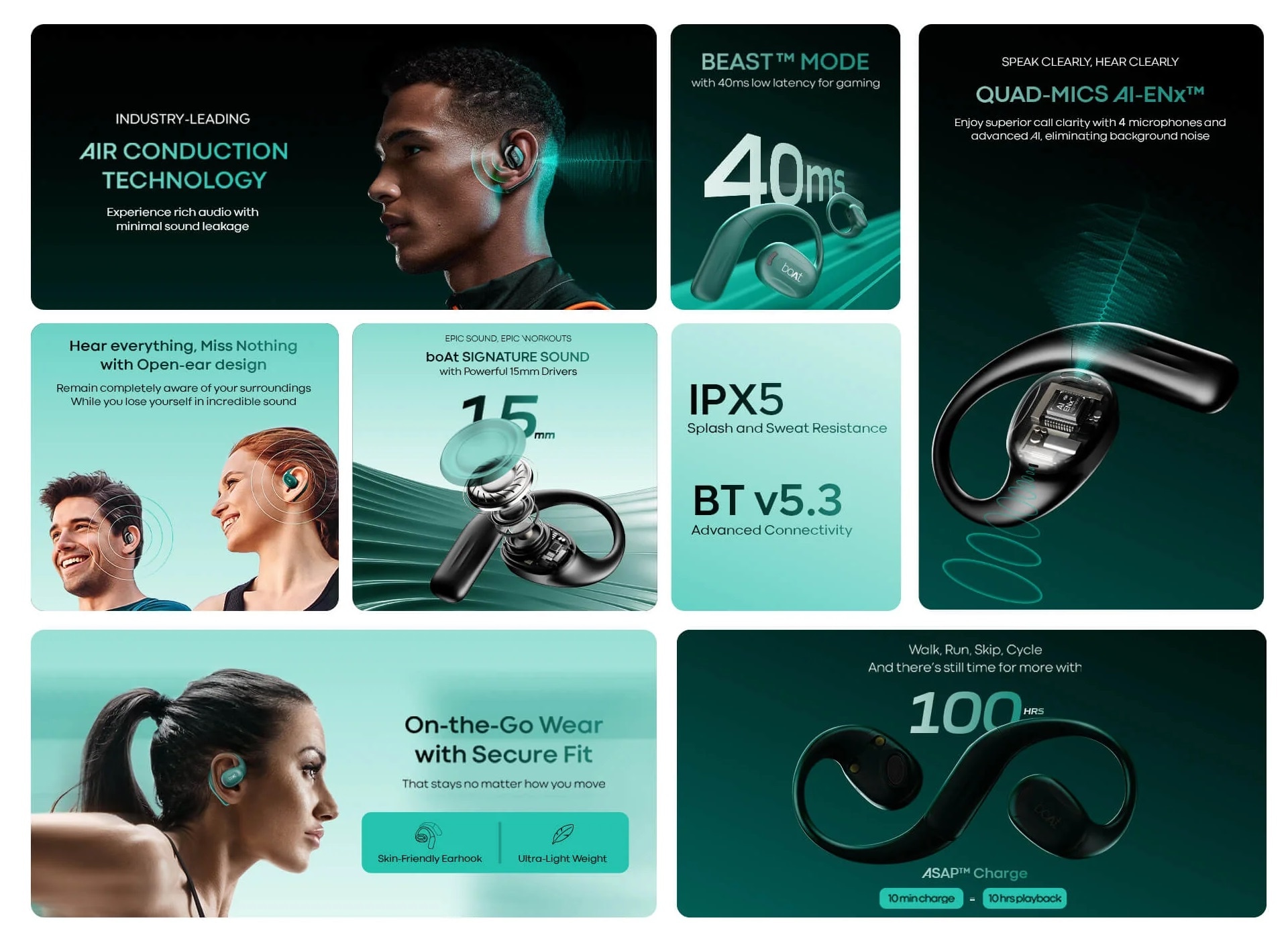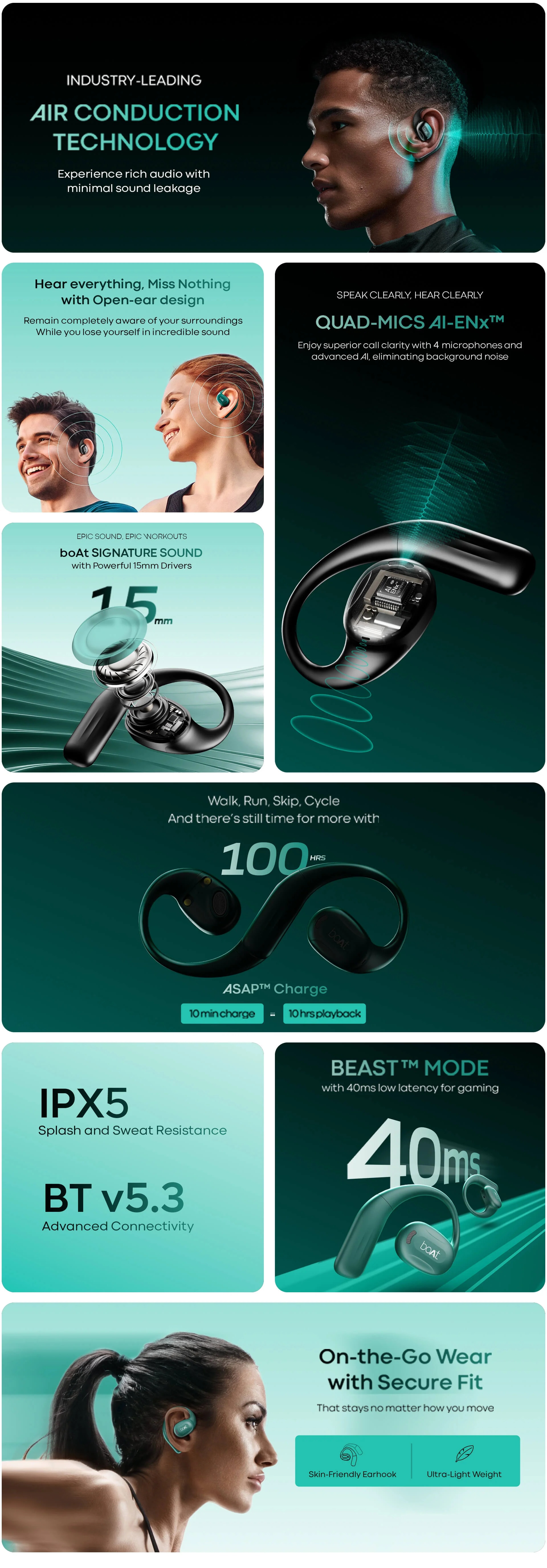 | Key Features | Air Conduction Technology 4 Mics with AI-Enx 100 Hours Playtime 15 mm Drivers BEAST Mode : 40 ms Low Latency ASAP Charge : 10 Min Charge = 10 Hours Playtime |