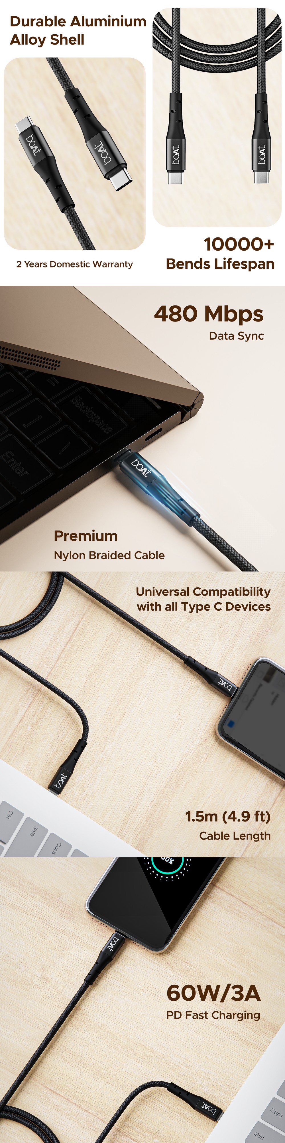 | Key Features | 60 Watts/3A PD Fast Charge 480 Mbps Data Sync 1.5 mtr Cable Length Flexible and Tangle Free Cable Premium Nylon Braided Skin Compatible with - Universal Compatibility |
