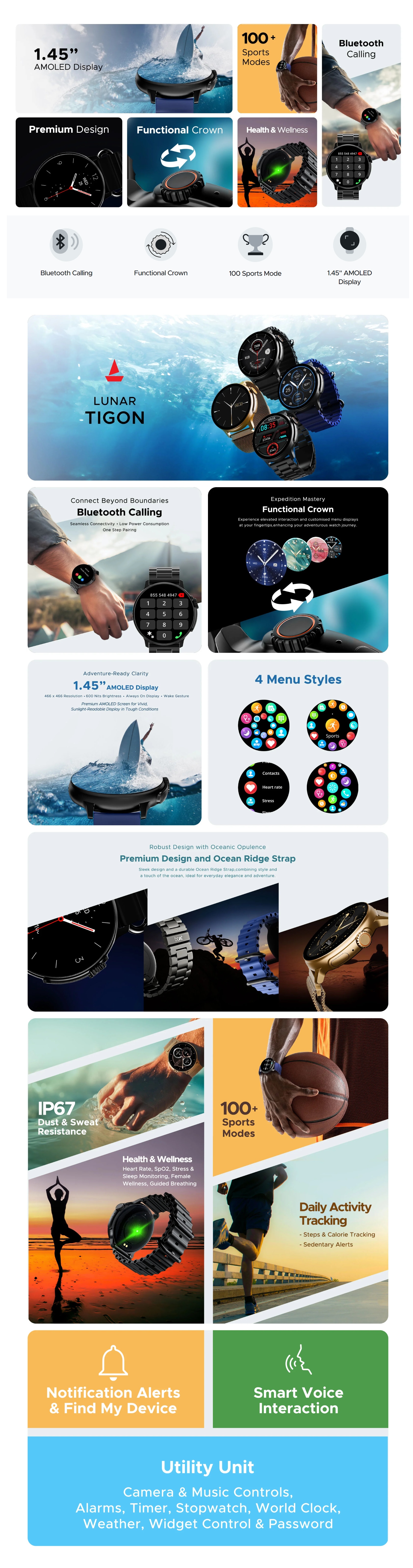 Device Protection Plan AddedboAt Lunar Tigon Smart Watch with 3.68 cm (1.45 inch) AMOLED Display, Advanced BT Calling, Always on Display, Functional Crown, Premium Design & Ocean Ridge Strap,IP67,HR & SpO2 Monitoring(Active Black)