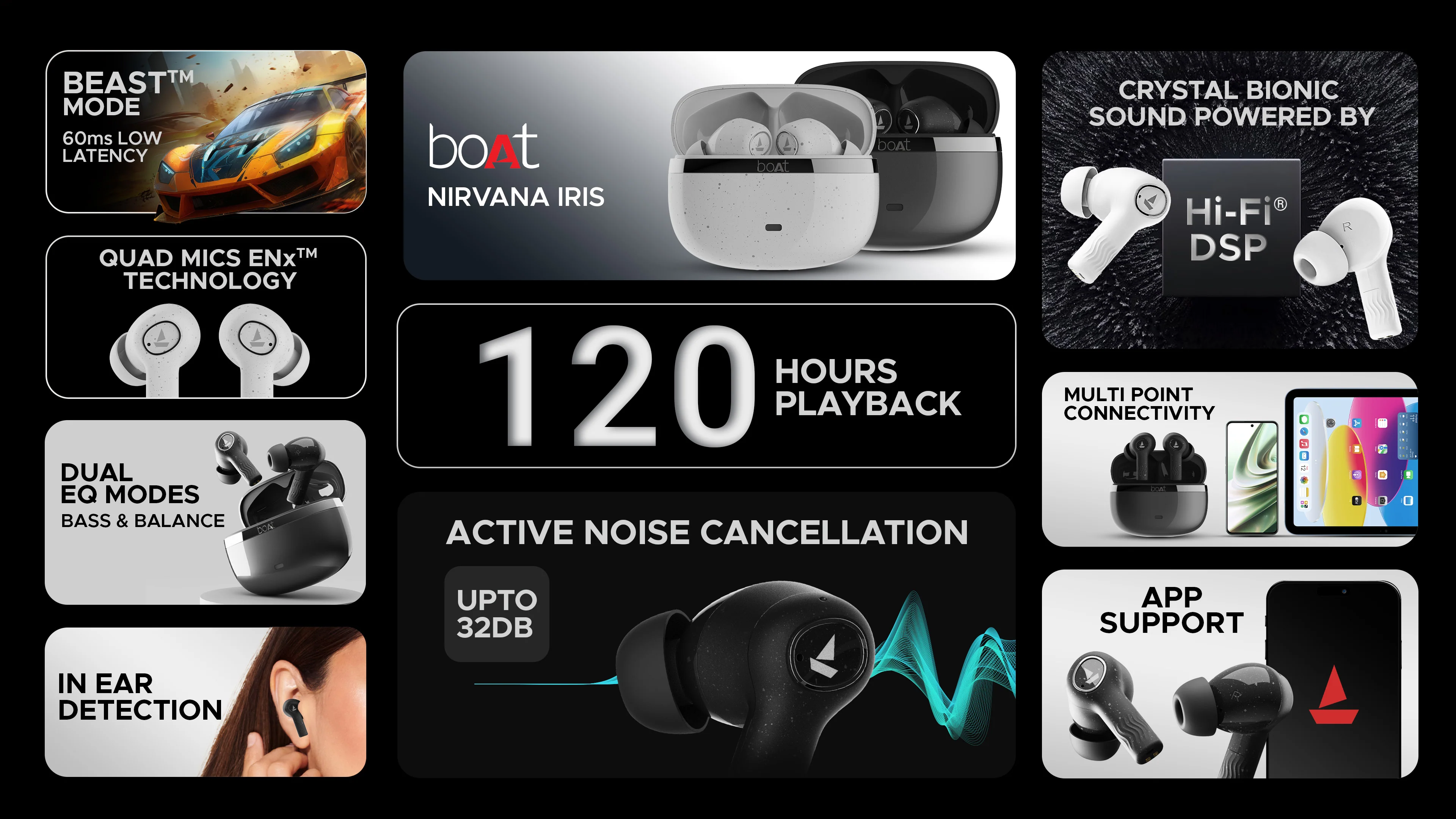 boAt Nirvana Iris Truly Wireless Earbuds, Up to 32 dB Active Noise Cancellation,120 Hrs Playback,Crystal Bionic Sound Powered by HiFi,Beast Mode,ENx Tech,Hearables App (Crystal Black)