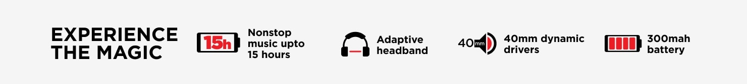 | Key Features | Up To 15 hours of audio excellence 300mAh Rechargeable Lithium Battery Crystal Clear 40mm Dynamic Drivers HD Immersive Audio Hey Siri and Ok Google Voice Assistant Bluetooth Range: 10 metre Bluetooth v4.2 Connectivity |