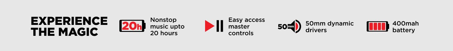 | Key Features | Up To 20 Hours Of Playtime 400mAh Rechargeable Li-Polymer battery Custom-designed 50 mm drivers Powerful Bass and Vocal Clarity Foam Ear Pads for Comfort-fit |