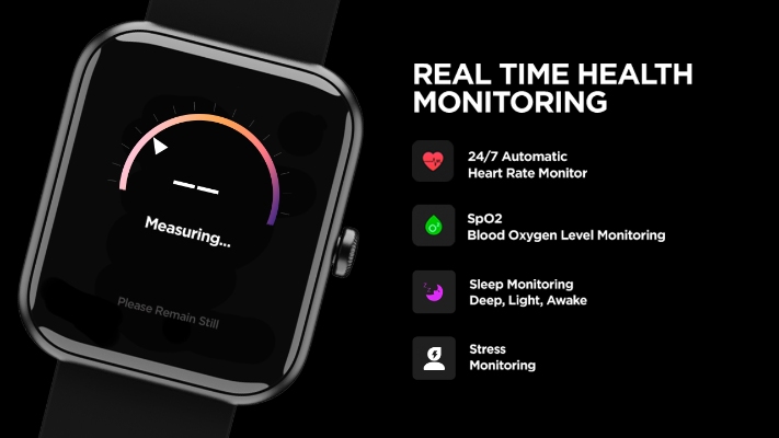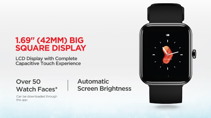| Key Features | 4.29 cm (1.69 Inch) Big Square LCD Display Automatic Screen Brightness Built-In Alexa Voice Assistant Real-Time Health Monitoring Upto 7-Day Long Battery 5ATM Water Resistance Daily Activity Tracker with 14 Sports Mode Notification Alert and Curated Controls |
