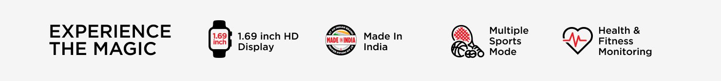 4.29 cm (1.69 inch) colour HD display with a square dial features a complete capacitive touch experience and responsive touch interface. The display provides crisp image quality, 500 nits brightness, and a visual experience that makes everything look larger than life.