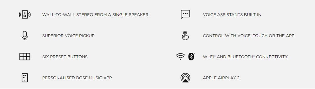 | Key Features | Personalised Bose Music App, six preset buttons Superior voice pickup, built in Amazon Alexa Wall-to-wall stereo from a single speaker Control with voice, touch or app Wi-Fi & Bluetooth connectivity |
