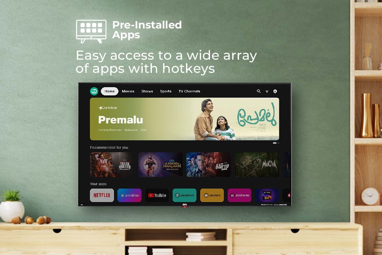 | Key Features | Pre-loaded Apps: Netflix, JioHotstar, Youtube, Prime Video, JioTV+, JioSaavn, JioGames, JioSphere TV Operating System: JioTele OS Resolution: Ultra HD (4K) Display (3840 x 2160) Connectivity: 3 HDMI and 2 USB ports Sound Output: 16 Watt Refresh Rate: 60 Hz |