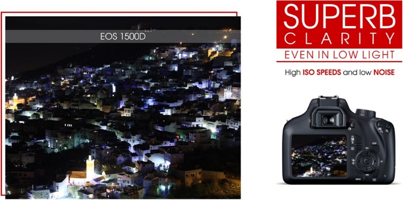 Canon 1500D is equipped with a sensor and a High-performance imaging processor that can capture the impression as it appears with High Sensitivity, rich gradations and image clarity even in dimly lit scenes.