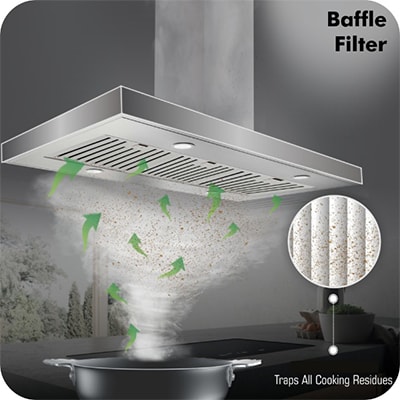 Featured with 2 baffle filters that enhance the utility by eliminating unhealthy smoke and greasy things from your kitchen. The baffle filters keep kitchen smoke & oil free. The filters are also easy to clean & maintain.