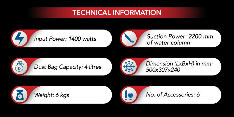 | Key Features | On-board accessory storage facility for quick access and convenient cleaning High power suction of 1400 W that can clean the toughest dust and dirt Automatic power cable winder which can store the cable into the unit with the press of a button Customized suction power settings with variable power control LED display that indicates when the dust bag is full and needs to be emptied for further use |