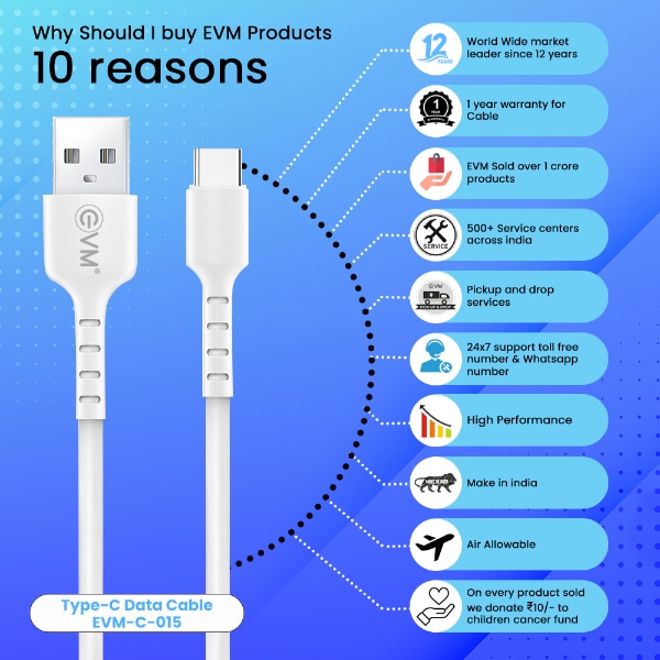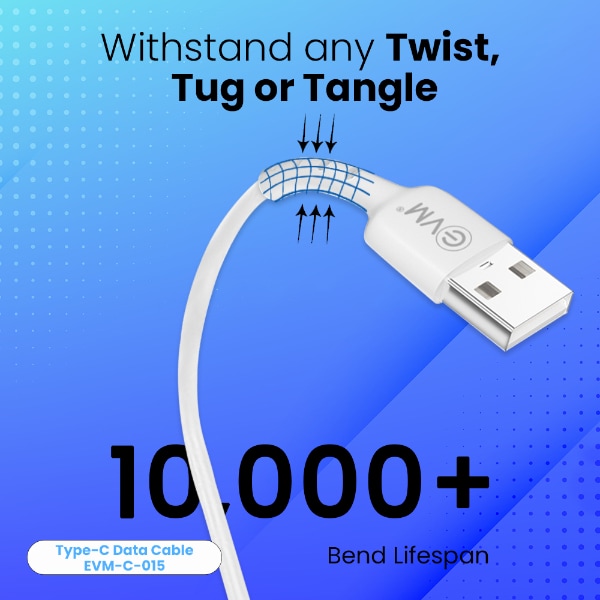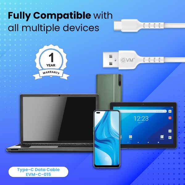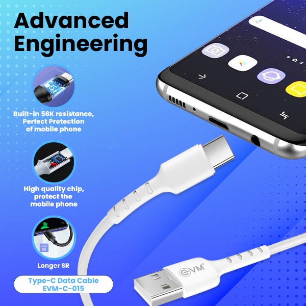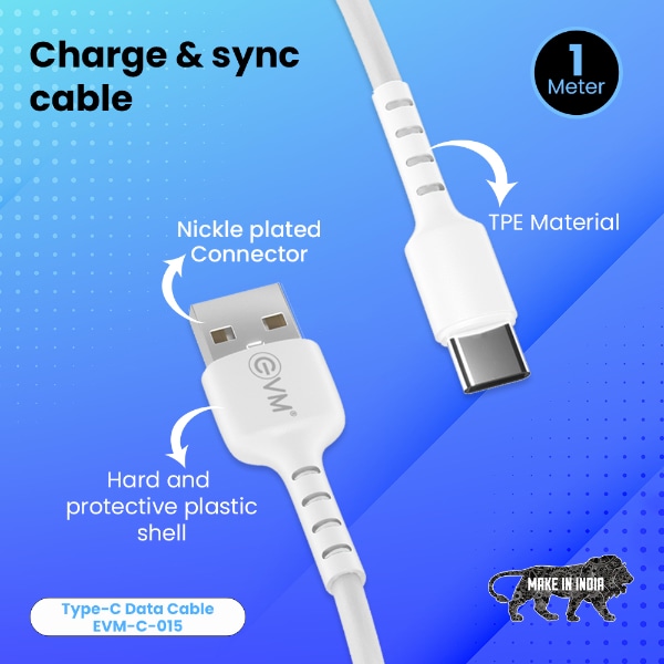EVM C015 Data and Sync USB-C Cable, 3 AMP Strongest, 100 cm (1 m) Length, Compatible with multiple devices, Temperature Protection, Sturdy & durable, Tangle Free, Bulit-in 56K resistant, White