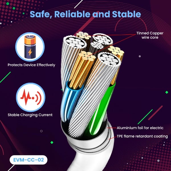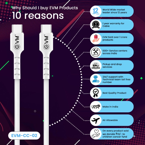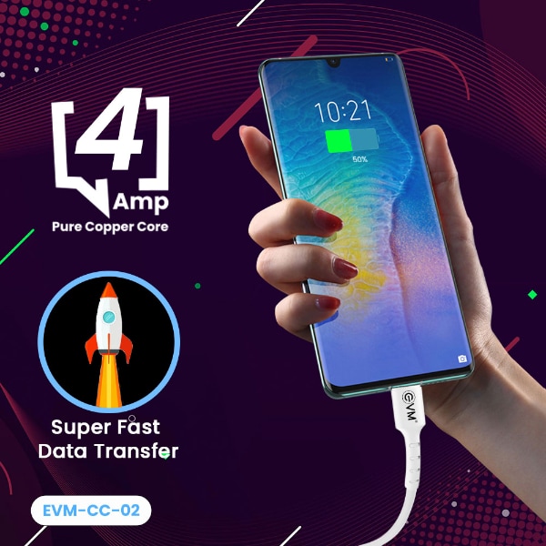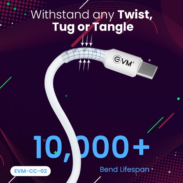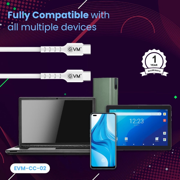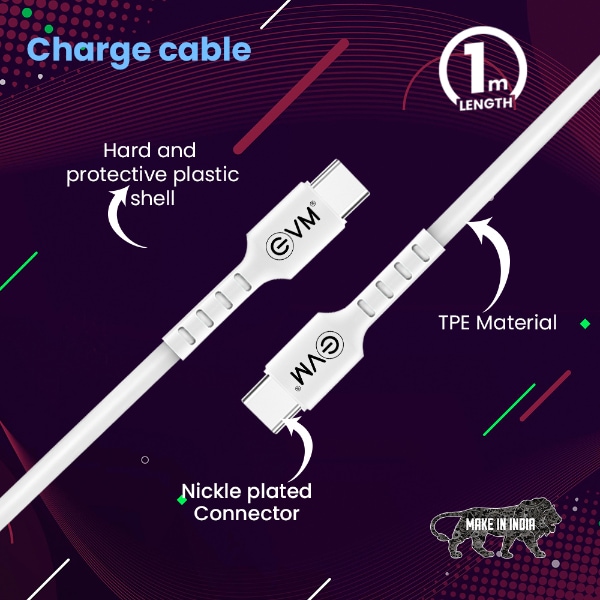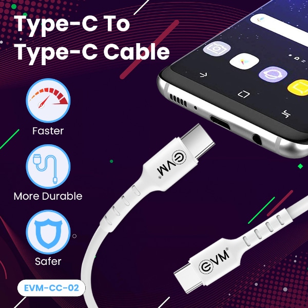 EVM Type-C to Type-C Charging Cable, 100 cm (1 m) Length, 4 Amp strongest pure copper core, 10000+ Bend Lifespan, Compatible with Phones, Laptop, Tablets, Super fast data transfer, White, EVM-CC-02