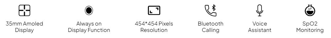 | Key Features | India's No 1 Smartwatch Brand Bluetooth Calling Voice Assistance AMOLED Always ON Display Spo2, H Rate and BP Monitoring Multiple Sports Mode Smart Notifications Multipe Watch Faces Water Resistant and Sweatproof In Built Speaker and Microphone Stress Management |