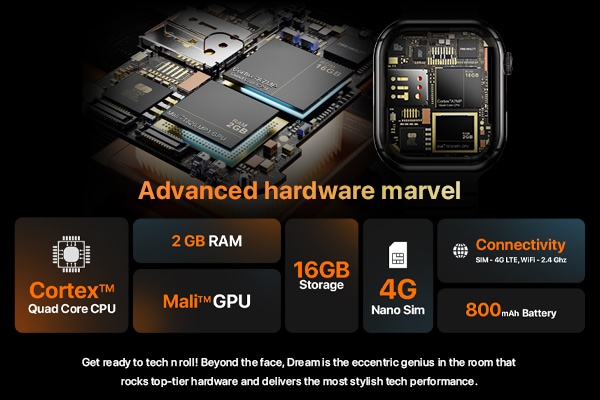 | Key Features | 5.13 cm (2.02 inch) HD Display: Enjoy a large, vibrant display with crystal-clear visuals, making it easy to navigate and interact with apps and notifications on the go. Supports 4G Nano-SIM: Stay connected without your phone by using the 4G nano-SIM feature for calls, messages, and internet access directly from your smartwatch. Supports 1000+ Apps: Expand your smartwatch's capabilities by downloading over 1000 apps from the PlayStore, covering fitness, productivity, entertainment, and more. Bluetooth Calling & Speaker: Make and receive calls with the built-in speaker and microphone, allowing seamless communication through Bluetooth calling. Big Battery with Magnetic Charging: Powered by a long-lasting battery, the smartwatch supports magnetic charging for quick and easy recharges, ensuring your device stays ready throughout the day. 2 GB RAM + 16 GB ROM: Enjoy fast and efficient performance with 2 GB of RAM for multitasking and 16 GB of internal storage to save apps, music, and files. Supports Wi-Fi & GPS: With integrated Wi-Fi and GPS, you can stay connected to the internet and enjoy accurate tracking for outdoor activities and navigation. High-Precision Health Tracking: Monitor your health with advanced sensors for heart rate, SpO2, sleep tracking, and more, providing comprehensive insights into your wellnes. |