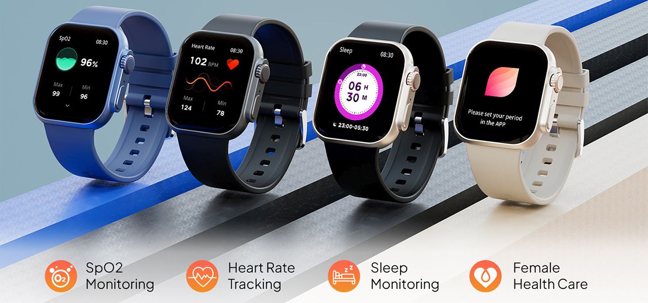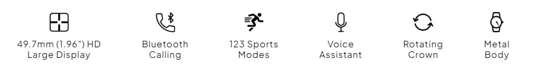 | Features | 240 x 282 Pixels Resolution 85 percent Screen Proportion 500 Nits Peak Brightness Inbuilt Mic & Speaker Voice Assistant SpO2 Monitoring Heart Rate Tracking Sleep Monitoring Female Health Care |