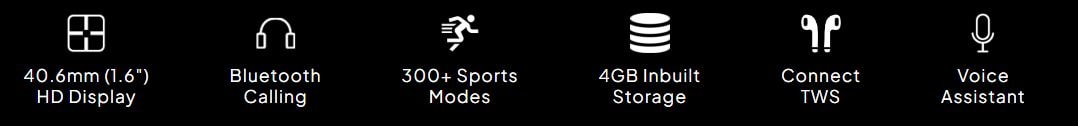 | Key Features | 4.06 cm (1.6 inch) Round Display, 400x400 Resolution Bluetooth Calling Smartwatch 300+ Sports Modes TWS pairing 4GB storage for 300+songs Voice Assistant Healh Tracking IP67 Rating, Music Player Dual Heart Rate Monitoring |