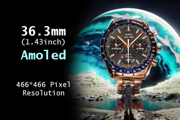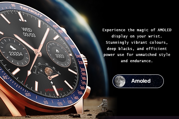 | Features | A Glimpse of Elegance: The Moonwatch Smartwatch presents a captivating 1.43-inch always-on round AMOLED display with a striking resolution of 466x466 pixels offering a visually immersive experience that sets it apart from the crowd. Power at Your Fingertips: With the convenience of wireless charging Moonwatch ensures that you stay powered up without the hassle of cables making your daily routine even more effortless. Unbreakable & Unforgettable Design: Crafted for durability and style the Moonwatch boasts a tempered glass cover a zinc alloy frame and steel straps combining resilience and sophistication in one stunning package. Seamless Connectivity: Elevate your communication game with Bluetooth calling a feature that keeps you connected on the go while maintaining the elegance of a classic timepiece. Battery That Lasts: Equipped with a high-capacity 300mAh battery Moonwatch is designed to keep pace with your busy lifestyle ensuring you never miss a beat. The watch needs to be charged for 3 hours to reach 100%. The charger should be a 3.7V to 5V adapter or any laptop output. For a bare minimum of 20% charge the watch needs to be charged for about 30-40 mins. Weatherproof Companion: The IP67 rating ensures your Moonwatch can handle life's surprises including dust and water resistance making it a reliable all-weather companion. Your Health Your Priority: Monitor your well-being precisely through various health-tracking features enabling you to stay on top of your fitness and wellness goals. (This is not a medical device). Every Sport Every Move: Moonwatch offers multiple sports modes catering to your diverse athletic interests and tracking your performance in any activity you choose. Stay Notified Stay Ahead: Receive smart notifications directly on your wrist ensuring you're always in the loop with messages and updates making your day more efficient and organized. |