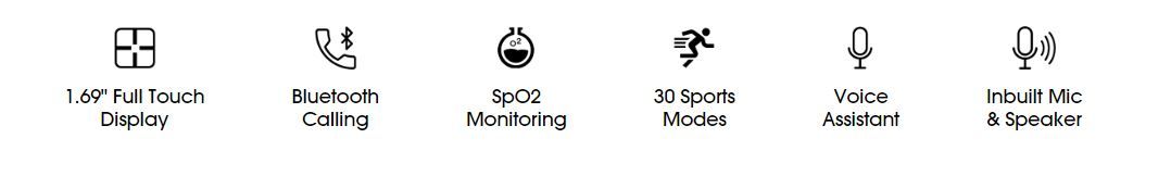 | Key Features | 4.29 cm (1.69 inch) Full Touch Display 240*280 Pixels Resolution Bluetooth Calling 30 Sports Modes Built-in Voice Assistant Multiple Watch Faces IP67 Water Resistant Real Time Health Monitoring |
