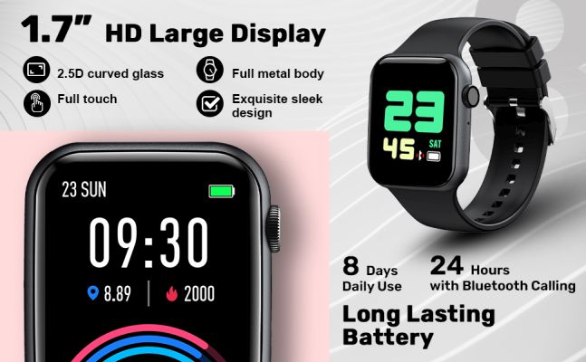 | Key Features | Bluetooth Calling 4.31 cm(1.7 inch) HD Large Display SpO2 Blood Oxygen Monitoring 8 Days Normal Use Multiple Sports Modes IP67 Water Resistant |