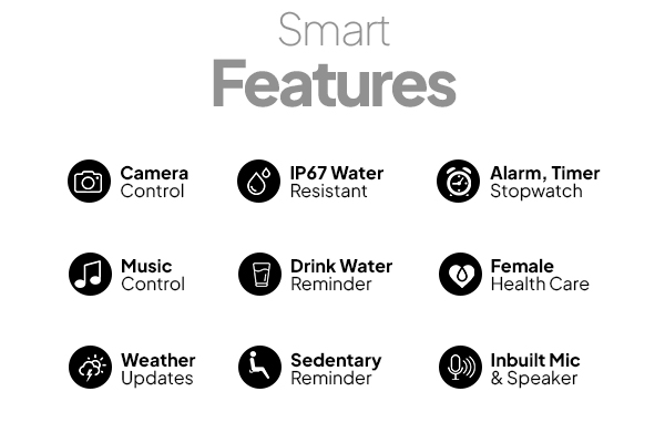 | Key Features | 35.3 mm (1.39 inch) HD Display IP67 Water Resistant Step Tracker, Sleep Monitor In Built Mic And Speaker |