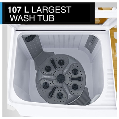 Wash heavy loads easily with 107 Litre Largest Wash Tub.