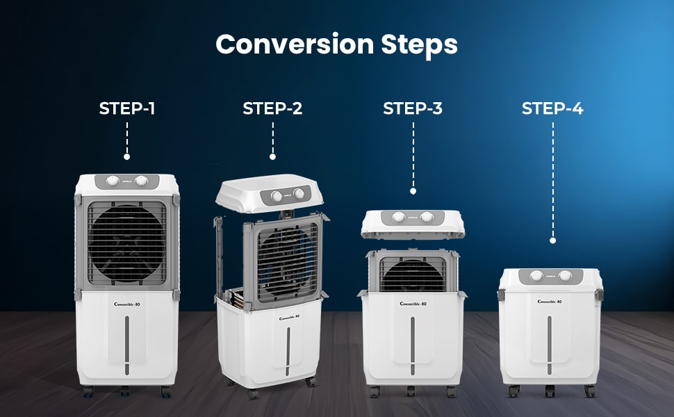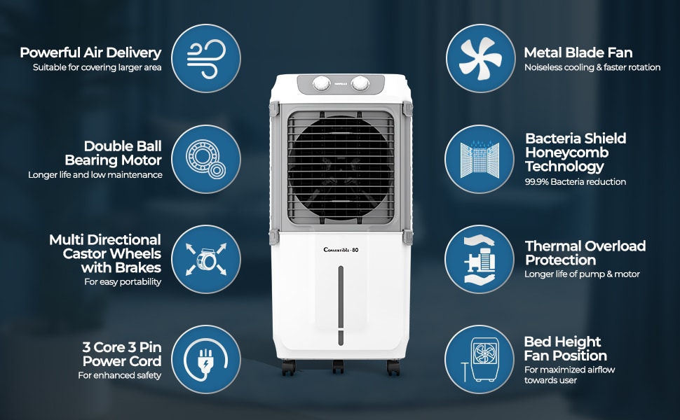 | Key Features | 80 L Tank Capacity Powerful Air-Delivery of 3500 m3/h 2-in-1 Convertible Water Heater- Can be used as side table in Closed condition Metal Blade Fan Bacteria Shield Honeycomb pad Technology Cooling Area - 409 square foot Drain Method - Drain Plug |