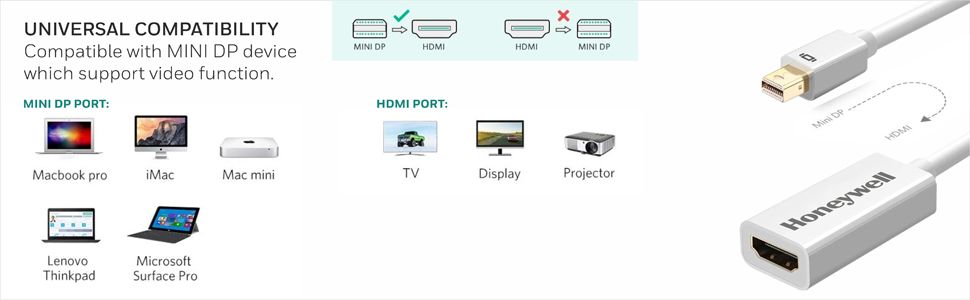 | Key Features | If you wish to project videos on your on your laptop onto an LED screen or larger, the Honeywell Mini Display Port to HDMI adapter is all you needFeaturing an impressive 3.0 Gbps HDMI bandwidth for all channels, enjoy superior connectivity coupled with HD video streaming for a smooth, informative and entertaining viewing |