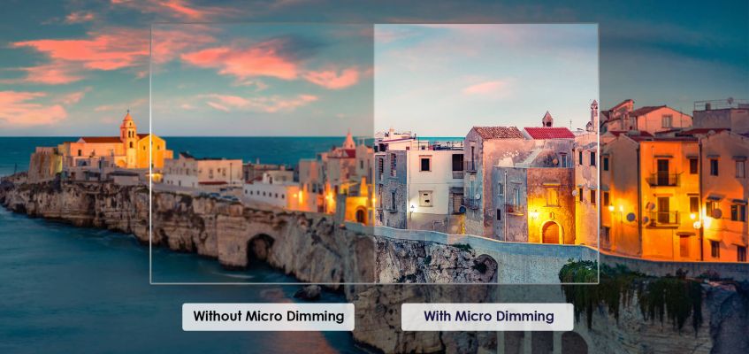 Micro dimming is developed to improve the aspect of LED performance by dimming the parts of the screen. This enhances the black and white parts of the display offering brighter whites and deeper blacks.