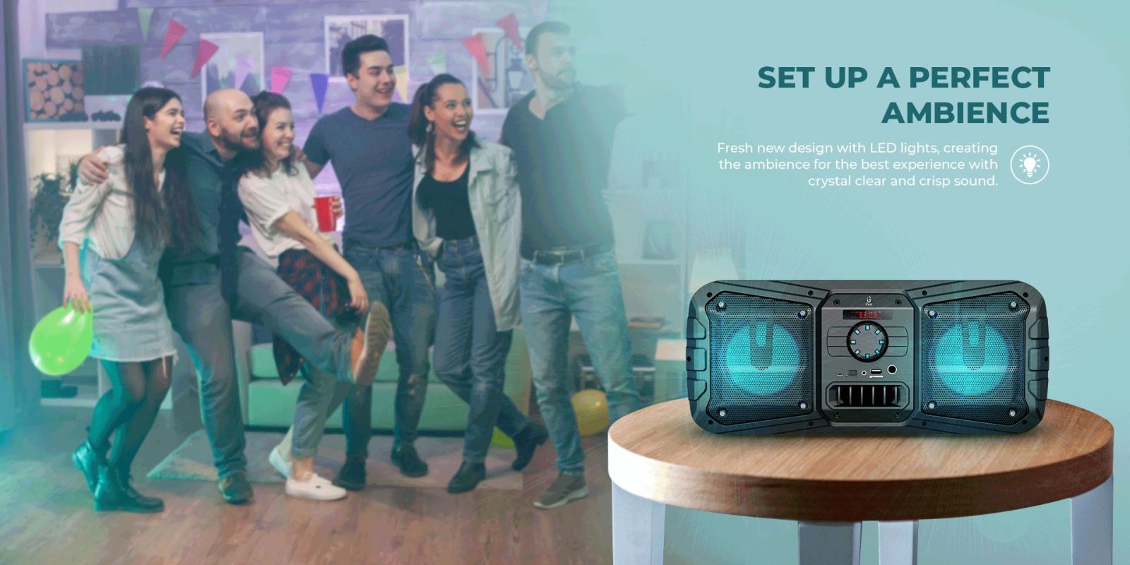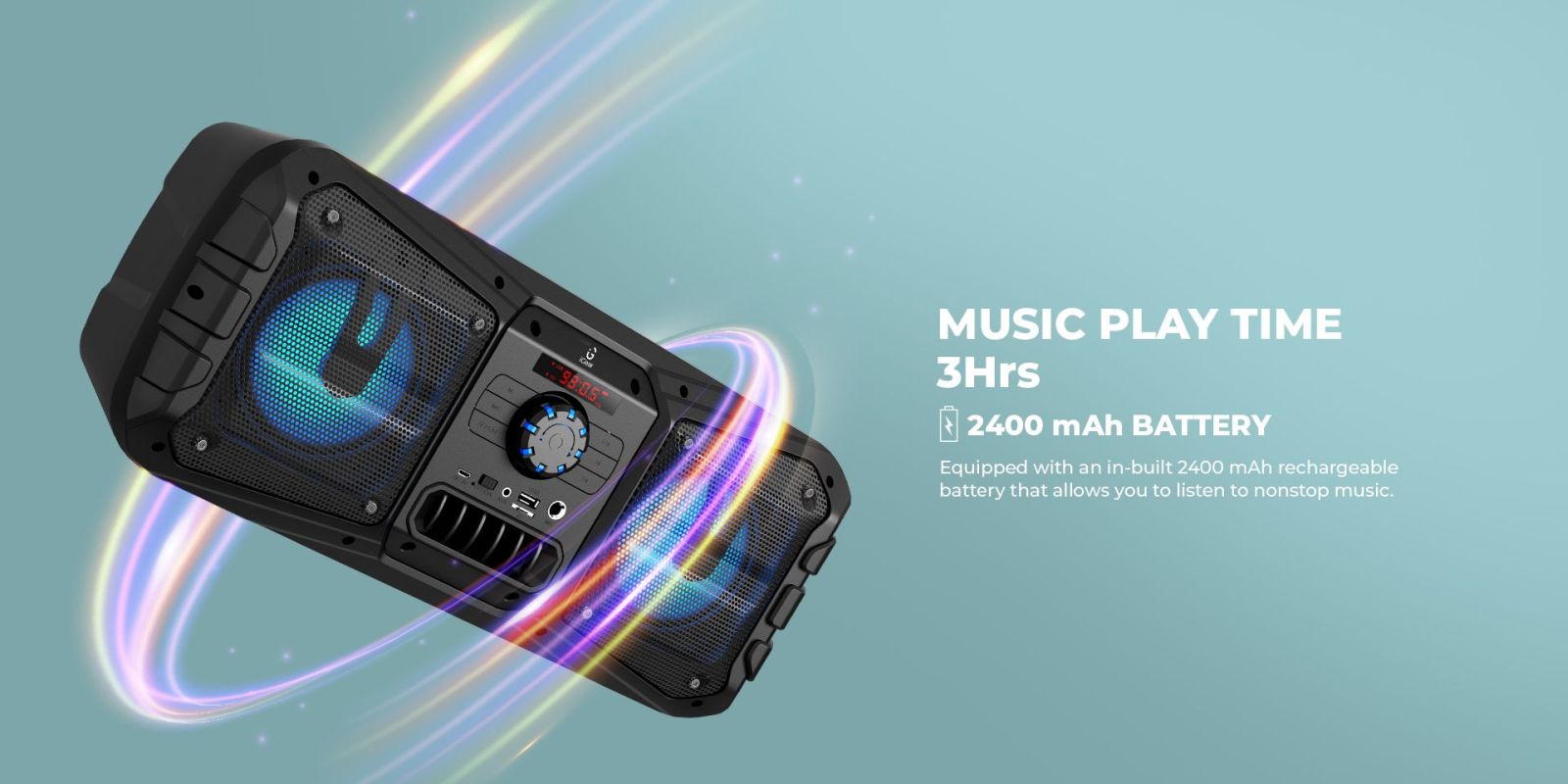 | Key Features | 10 watts bluetooth speaker Multiple playing options - FM Radio, USB, TF/SD Card, AUX Port, Bluetooth Corded Mic support 2400 mAh Li-ion rechargeable LED lights for effect TWS Function, Portable |