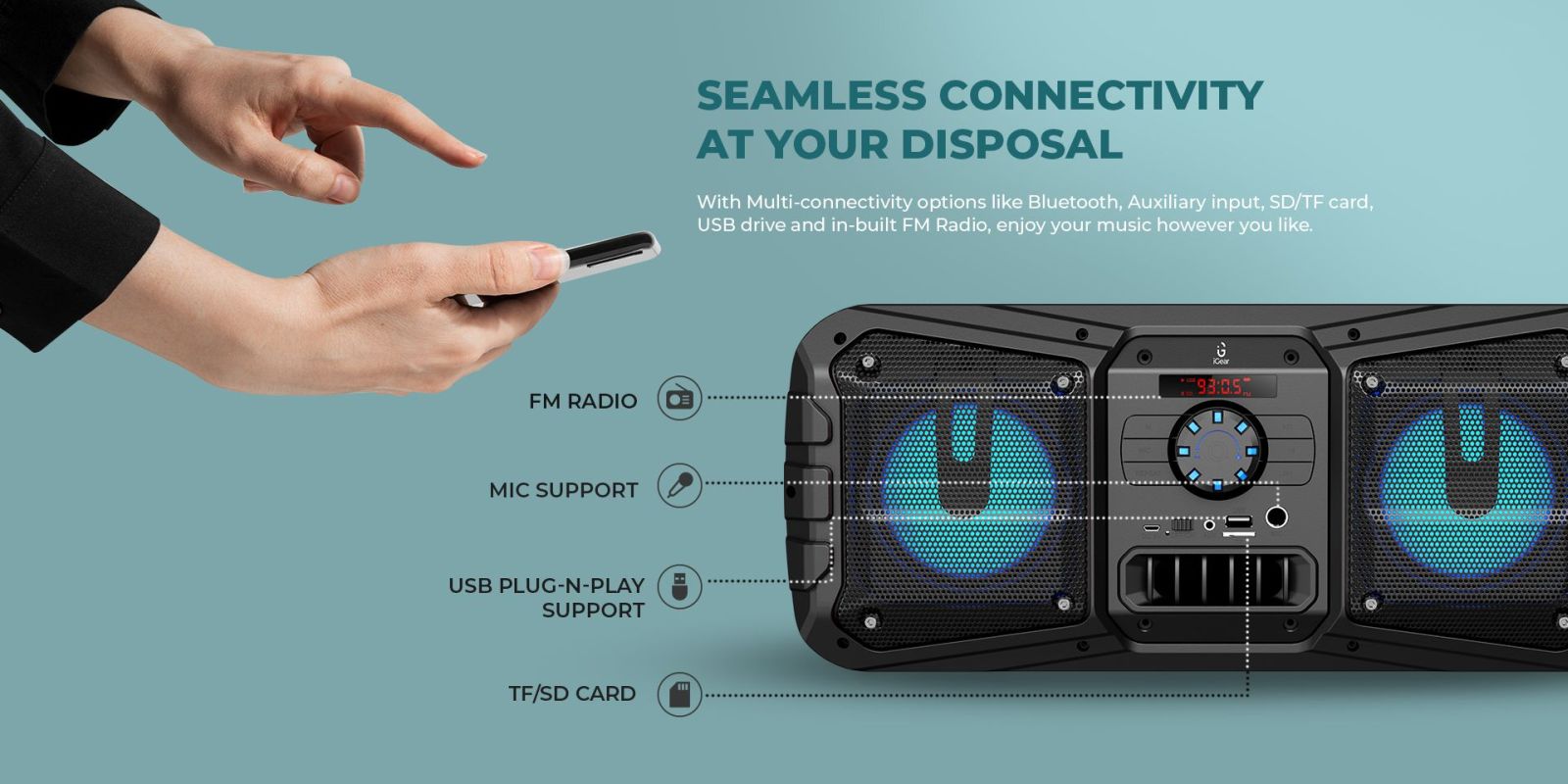 - Multiple playing options - FM Radio, USB, TF/SD Card, AUX Port, Bluetooth
