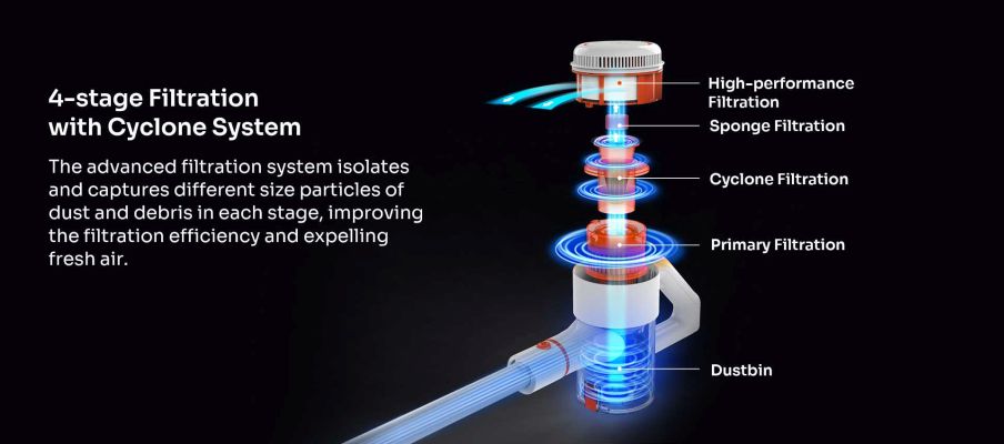 - 4 stage filtration with a cyclone system to separate different sized dust particles