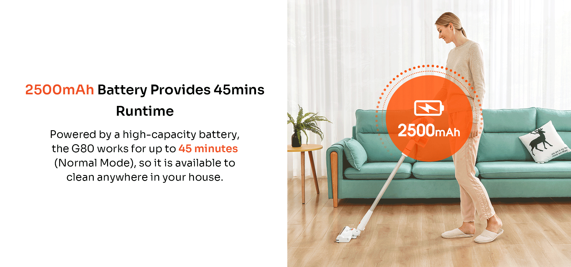 - High capacity 2500mAh battery that allows efficient cleaning for 45 minutes