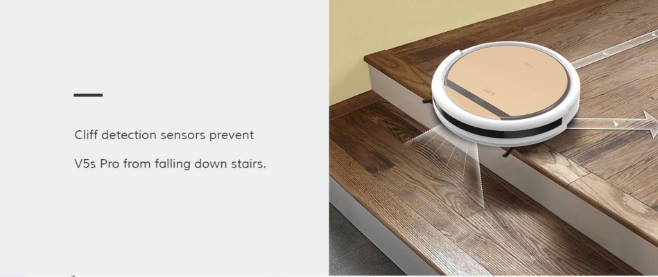 Cliff detection sensors prevent V5s Pro from falling down stairs.