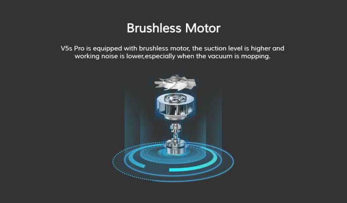 V5s Pro is equipped with brushless motor, the suction level is higher and working noise is lower, especially when the vacuum is mopping.