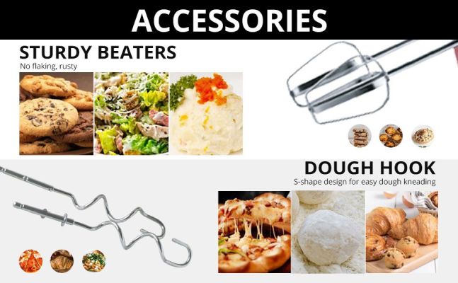 - Attachments for all your cooking tasks:Beat,Mix,Whisk,Blend,Mash with high quality stainless-steel attachments.2 Detachable Beaters & Whisker/Dough Hooks that will take care of your meal preparation. Now making doughs& batters is quite an easy task