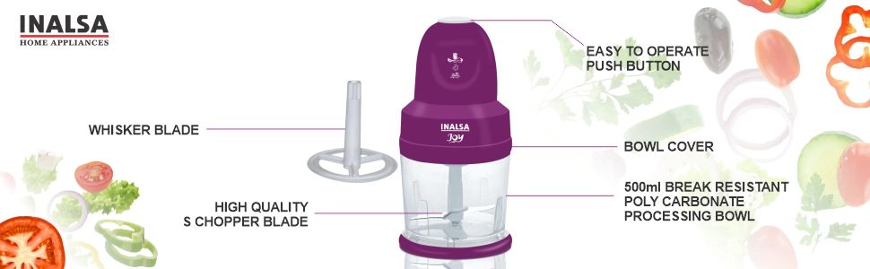 As 500ml (total capacity) Transparent processing bowl of Inalsa electric chopper comes with a transparent jar for extra durability and provides visibility to chopping levels.It has press button at the top that makes it easy to use and gives you better control for fine chopping.